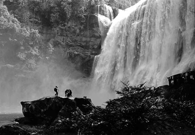 而上游的陡坡塘瀑布,给人的是排山倒海的壮观气势,层层叠叠奔涌而下,滔滔不绝地翻滚着千古的往事。螺蛳滩瀑布滩面最长,在洪水时节蔚为壮观。滴水滩瀑布最高,倾泻百米,恰似李白在《望庐山瀑布》中的“飞流直下三千尺,疑是银河落九天”诗句。