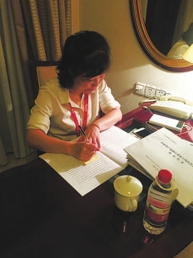 | 6月12日晚,记者到代表团驻地采访时,赵红霞正在重温报告做摘录。见习记者邹霏霏 摄 |