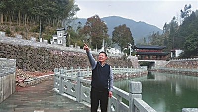 | 站在水口景观湖边,羊宝指着高端民宿开发的地块,对今年的村庄建设早已胸有成竹。 记者羊荣江 摄 |