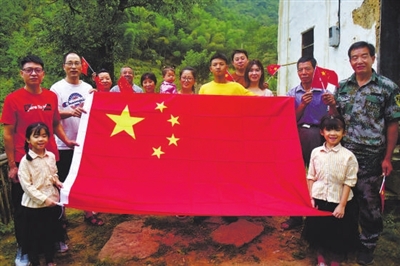 | 昨日清晨,武义南部山区新宅镇铁铺村已故老红军戴章荣儿孙三代,在半山腰祖屋门前升起鲜艳的五星红旗。 |