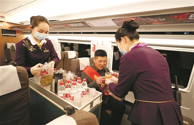 “我还是第一次被乘务员同事服务。”冯明笑着说。