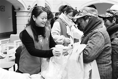| “范大姐”(左)发起公益行动“爱暖冬阳”,为环卫工人送爱心早餐。 |