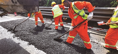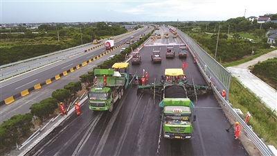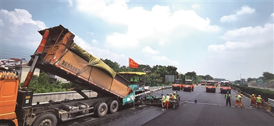 值得一提的是,全体参建者在路面罩面封闭施工时间,你追我赶,奋勇争先,同步推进天桥拆除重建、互通匝道及服务区改建、路面病害处理等涉路施工,实现施工效率和社会效益最大化。单是吕塘角枢纽至五里枢纽段施工期间,就有30余个班组1000余名工人参加施工,并以单日1万余吨的SMA-13沥青混凝土、日均完成约6公里路面沥青摊铺的速度展开。“在路面罩面集约化封闭施工中,参建单位与参建单位之间、班组与班组之间,班组内部员工之间形成了你追我赶、奋勇争先的良好竞赛氛围,全体参建者在项目建设中建功立业。”指挥部副指挥毛美华表示。