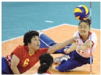 郑雄鹰(左一),原为中国女子坐式排球队队员,现为桐庐县残疾人联合会职工。7岁那年,她遭遇车祸,右腿膝盖以下永远失去了知觉。酷爱体育的她,身残志不残,即使一只脚不能沾地,100米也能跑进15秒。杭州残运会上,她破了铅球和标枪两项全国纪录。2000年进入浙江女子坐式排球队学习排球,2001年入选国家队。