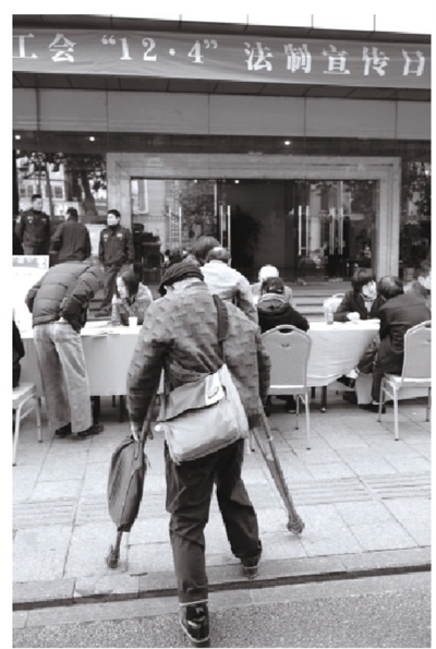 | 在每年举行的省、市工会“12·4”法制宣传日活动现场,总有工伤职工来寻求援助。虽然维权的路走得很艰难,但他们相信职工的“娘家”,一定会依法帮助他们,不能伤了身体再伤心! 记者周金友 摄 |