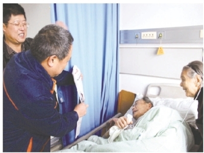近年来,该公司注重人文关怀,连续多年开展“送温暖,暖人心”活动,坚持“五必访”,帮助职工解决具体困难,得到广大退休职工的好评。图为公司党委书记尹雪生给躺在病床上的陈振华看刊有他照片的2014年11月20日的《浙江工人日报》。