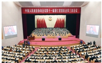 | 昨天上午,浙江省政协十一届三次会议在省人民大会堂隆重开幕。记者周金友 摄 |