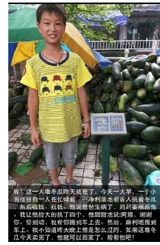 2014年7月15日一大早,一条标题为《帮帮这个卖冬瓜的小男孩吧》微信在我的朋友圈内被疯狂转发。