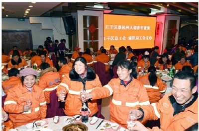 昨晚很冷,昨晚很暖。杭州市江干区总工会携手区城管局工会,请辛勤劳动一年,春节不回家坚守工作岗位的150多位优秀环卫工人和停车收费员,早早地吃上了团圆、欢乐、喜庆又温馨的年夜饭。笑个不停的环卫工人黄文良,停车收费员周业芹说,“今晚太高兴了。我们从心底里感受到了工会的关怀,第二故乡的温暖。”
