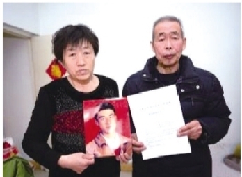 | 李三仁、尚爱云拿着儿子呼格吉勒图照片与《国家赔偿决定书》。 |
