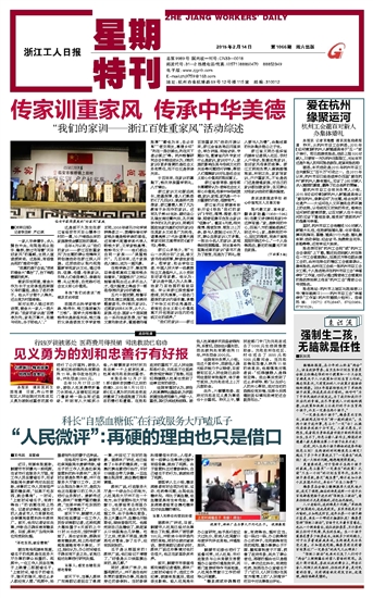 去年4月以来,以“我们的家训——浙江百姓重家风”为主题的群众性精神文明创建活动在浙江深入开展。这项活动以现代视角重新审视家训文化,通过寻找、征集、传播、传承家训,引导人们修身律己、崇德向善、礼让宽容,自觉践行社会主义核心价值观。