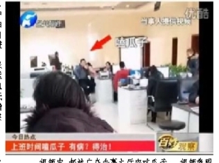 | 视频中,郝林广在办事大厅内吃瓜子。 视频截图 |