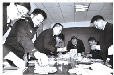 春节前夕,嘉善法院执行局干警在接待大厅举行执行款发放大会,为一纺织有限公司77名工人发放被拖欠的工资近180万元。
