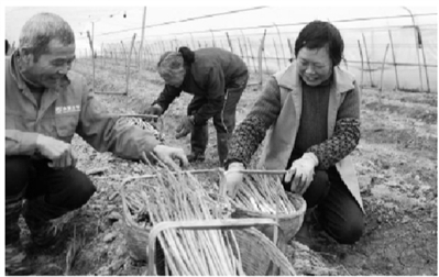 2月26日,建德市杨村桥镇种植大户叶青采用双层薄膜种植的30多亩芦笋开始组织村民进行采摘上市,每公斤批发卖出20元的好价格,畅销市场。据负责人介绍,这些天来,基地每天可采收100多公斤,以销往兰溪、龙游及本地市场为主。 通讯员宁文武 摄影报道