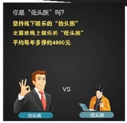 随着手机等电子产品的普及,有60%的人开始线上娱乐,成为“低头族”。而还有40%的人坚持线下娱乐,坚持“抬头族”。