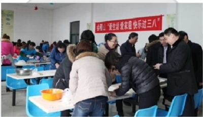 3月7日上午,为庆祝国际三八妇女节,会稽山绍兴酒股份有限公司工会在第一食堂举办了一场新颖独特、热闹非凡的“爱生活、爱家庭、快乐过三八”包饺子比赛活动。来自行政、销售、酿造二厂、灌装一厂的17支队伍、63名女职工参加比赛,公司董事长金建顺亲自到现场观摩比赛,让大家倍感公司大家庭的温馨。