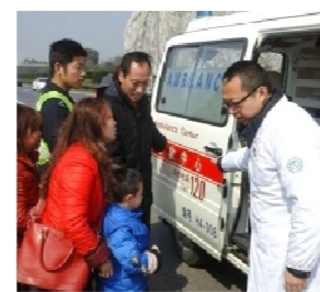 | 图为柴宏玮(右二)协助医务人员送受伤乘员上急救车 |