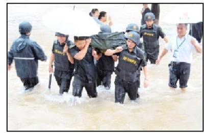 2009年9月30日,温岭市遭遇百年一遇的特大暴雨,市区成了水乡泽国,为了保证国庆期间广大客户大额取现需求,中国银行温岭支行迅速启动应急预案,第一时间会同安邦押运公司顶着台风,冒着特大暴雨,涉水从5公里外的市人民银行出库9500万元人民币。图为中行员工与安邦押运员顶风涉水的运钞镜头。滕建荣 摄