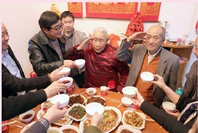 | 沈如刚和94岁高龄的中国驻印军独立战车第七营修理连中尉技术员、黄埔十八期机械兵科章策(右一),向敬酒的热心人士行军礼。 |