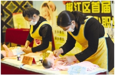近日,台州市椒江区首届“巾帼之星”育婴师(月嫂)职业技能比武大赛在新椒江宾馆举行。30名育婴师同台比拼技能,比赛内容包括婴儿抚触、脐部消毒、婴儿沐浴等婴幼儿日常生活保健与护理方面。对大赛中决出的10名技高一筹的育婴师(月嫂)授予了“金牌育婴师”称号。