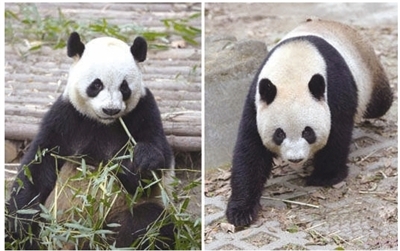 这是3月31日拍摄的大熊猫“娅林”(左)和大熊猫“蜀蓉”(拼版照片)。