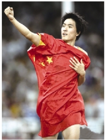 图为2004年8月27日,刘翔在雅典奥运会男子110米栏决赛中夺冠后身披五星红旗庆祝。他以12秒91的成绩夺取金牌,并平了世界纪录。