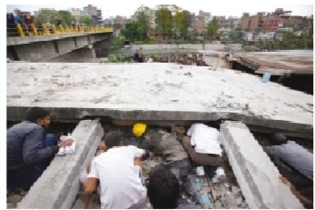 | 尼泊尔加德满都,救援人员在建筑废墟下面寻找遇难者。 |