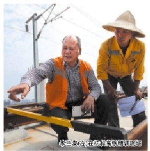 | 李兰发(左)在杭长高铁精调现场 |