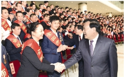 | 夏宝龙、李强等省领导与劳模先进亲切握手。 记者周金友 摄 |