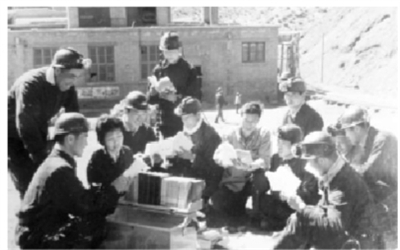 | 上世纪70年代,作者(前左一)下井前观看矿流动图书站的图书。 |