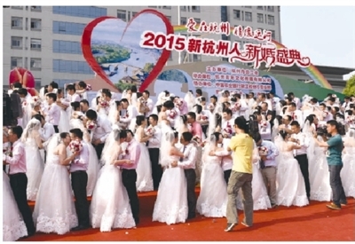 今年“五一”,杭州市总工会举办以“爱在杭州,情缘运河”为主题的2015“运河情”新杭州人新婚盛典,给劳动者的节日再添喜庆气氛。100对来自各行各业的新杭州人的集体婚礼, 以传统而又时尚的形式,唱响了古运河畔的爱情颂歌。杭州市人大常委会副主任、市总工会主席郑荣胜担任主婚人并致主婚词, 6位刚从北京授奖回来的“新科”全国劳动模范为新人们颁发纪念证书,打开幸福之门。
