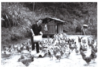严红中养的土鸡吃的食料是米糠、麦麸、玉米粉,喝的是山沟里的山泉水,属生态型土鸡,所以没出本地就热销一空。图为严红中正在用米糠喂土鸡。