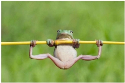 照片中,树蛙抓着特殊的单杠——一根树枝,自由地做着单手引体向上和时髦的瑜伽动作,肢体灵活优美。