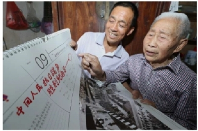| ▲ 为不忘记中国首个抗日战争胜利纪念日,沈老特意在挂历的9月3日注明中国人民抗日战争胜利纪念日,叮嘱四儿子沈华城(左一)一道记住这特殊的日子。 |