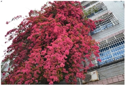 5月17日,在玉环县玉城街道的康育小区里,一株三角梅开得极是“霸气”,“花瀑”一泻5层楼,装点着小区的美丽和喜庆(下图)。