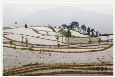 梯田的美,美在点、线、面的相互交融。树木为点、田埂为线、水田为面,似一首轻快的乐曲,又似一幅充满诗情画意的美图。它的地点在永嘉。 蒋晓东 文/摄