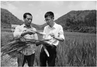 图为汪顺仲(左)正在向我们介绍茭白生产情况。