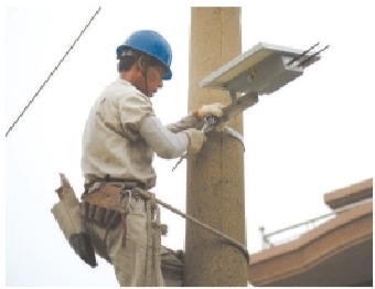 近日,在萧山新街镇长山头村一条村道旁,国网杭州市萧山区供电公司工作人员正在电线杆上安装架空线路在线监测终端装置(如图)。该装置以太阳能和锂电池为动力源,通过在架空线路上驻点,实时监测线路运行情况并报送故障信息,可有效缩短线路故障处理时间。目前,萧山供电公司正在批量推进这套“千里眼”设备的安装工作,为即将到来的夏季用电高峰提前做好准备,确保老百姓用电更可靠。徐国锋