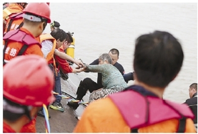 | 6月2日中午12时52分,在湖北监利长江客轮事件现场,一位老人被潜水员救出。新华社发 |