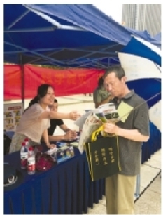 | 工会工作人员向现场的职工群众免费分发职业科普读本。 记者吴晓静 摄 |