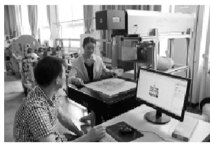 | 图为学生用激光打标机在雕刻家纺产品。 |