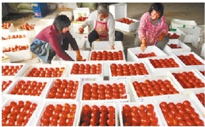 图为7月12日,磐安县绿福蔬菜专业合作社员工在抢收受灾早熟高山西红柿。