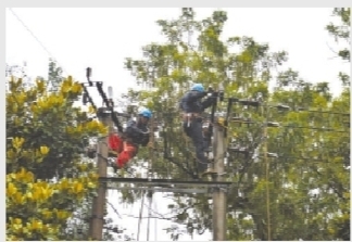 台风“灿鸿”期间,国网湖州供电公司党员服务队迅速出击,顶风冒雨开展抢修,快速恢复电力线路供电。图为7月12日,湖州电力员工迅速赶到现场排除配变开关故障。