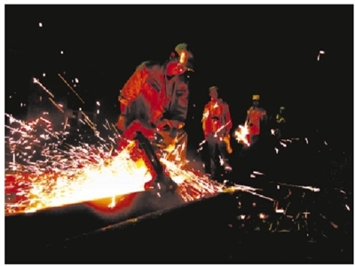 | 夜间磨轨,焊花四溅。 陈慈林 摄 |