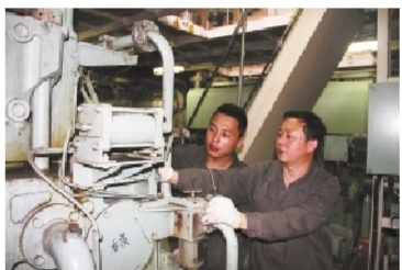 | 轮机长薛国标(图右)指导实习轮机员进行检修。 |