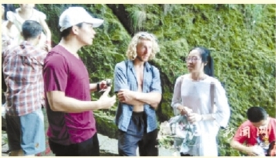 8月2日,奥地利“蜘蛛侠”迈克·凯米特(右二)前来江郎山景区进行考察。在今年9月的第二届中国·衢州江郎山国际旅游节,他将在尽可能脱离保护的状态下,完成徒手攀爬江郎山、高空走钢丝跨越两峰、从峰顶低空跳伞三项极限挑战。图为迈克·凯米特咨询江郎山景区相关情况。