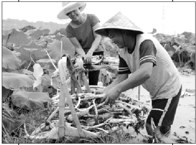 建德市更楼街道新市村的莲藕种植户叶润祥,今年因为对种植的10多亩菜藕采用沼液作为有机肥,使鲜藕保持脆嫩的时间得以延长,从而适应了市场竞争需要。现在采收上市的莲藕,与一般在秋末采收的成熟莲藕相比,相对来说尚未完全长成,吃起来感觉特别鲜嫩,所以颇受美食者的青睐。现在上市莲藕虽然产量低一些,但市场售价不低,零售价格每斤12元,利润相当可观。图为叶润祥夫妇近日正忙着采收头茬鲜藕时的场景。