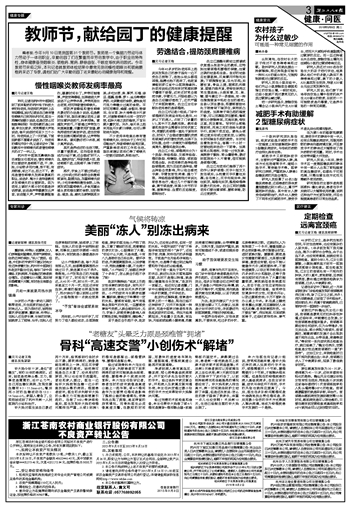 编者按:今年9月10日是我国第31个教师节。教师是一个集脑力劳动与体力劳动于一体的职业,辛勤的园丁们在繁重而辛劳的教学中,由于职业的特殊性,身体健康备受咽喉炎、颈椎病、胃病、静脉曲张、干眼症等疾病的困扰。今年教师节来临之际,本刊记者就教师体检结果中最常见到的慢性咽喉炎和颈肩腰椎病采访了专家,请他们给广大辛勤的园丁送来最贴心的健康指导和提醒。