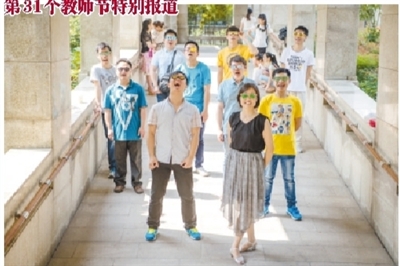 | 毕业照上,学生们和邱建维老师(图前)戴上精心设计的眼镜。 |