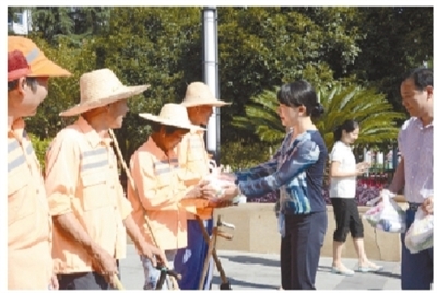 | 8月6日,磐安县委书记陈蕾妍给环卫工人送清凉。 |